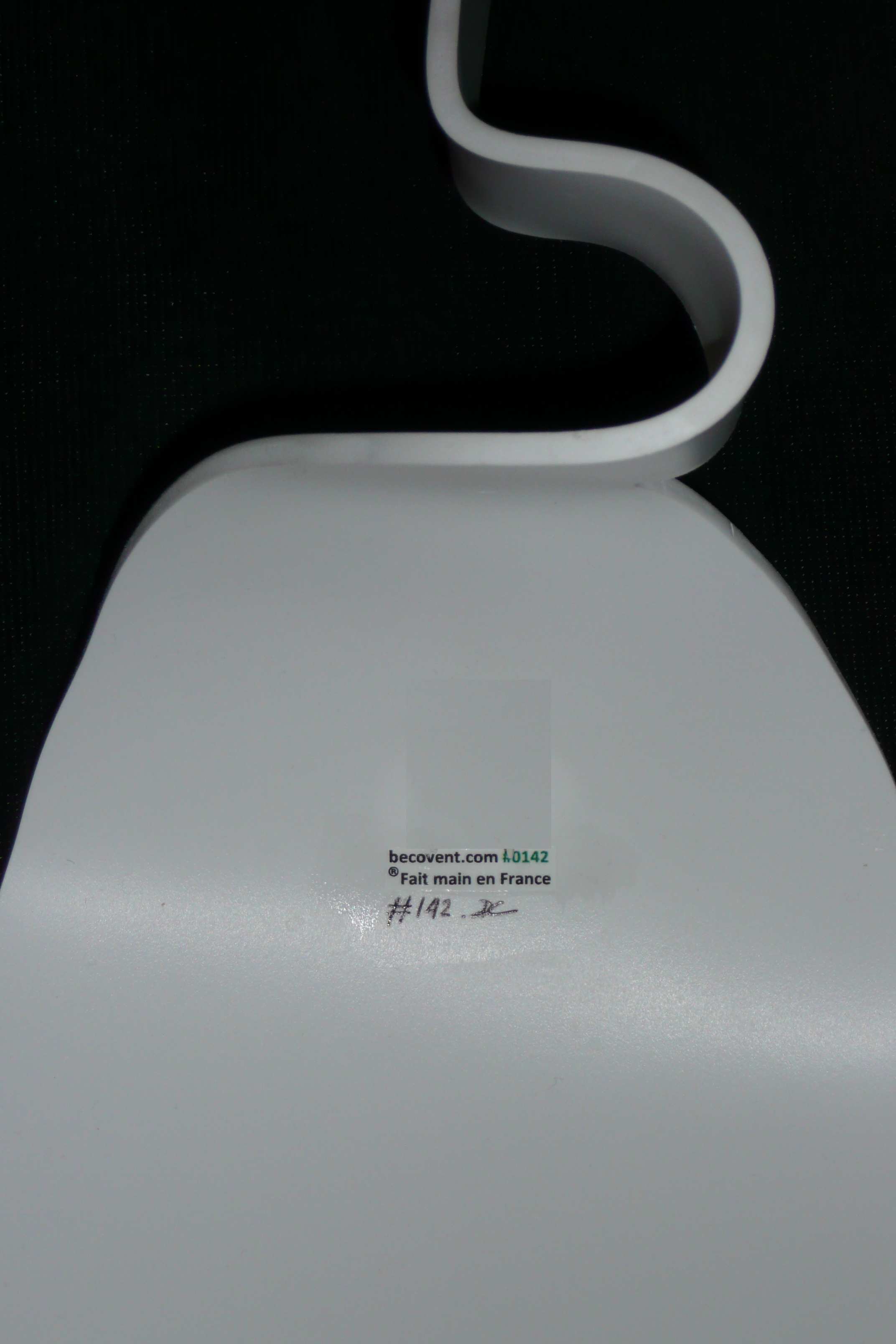 Plus d’une trentaine d’opérations, depuis la feuille blanche à la validation finale, sont nécessaires à la création d’un modèle Bec-Ô-Vent parfait. La dernière action consiste à lui donner son numéro de création et d’apposer la « griffe » manuscrite. La photo ci-dessous illustre cet étiquetage très personnalisé que reçoit chacun des modèles Bec-Ô-Vent.